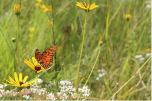 Swamp sunflower (Helianthus heterophyllus) blooms in a savanna that received a prescribed burn in early June. Skipper sp. drinks nectar from Dense blazing star (Liatris spicata) As the temperatures begin