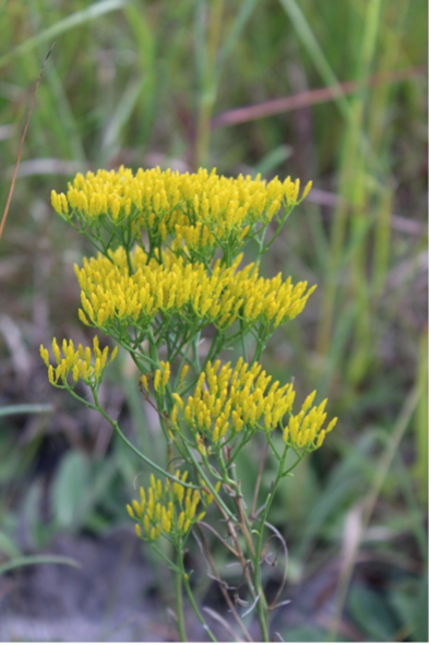 Pineland rayless goldenrod (Bigelowia nudata) and Grass-leaved goldenrod (Euthamia spp.) are two smaller species with only disc-like flowers. True goldenrods (Solidago spp.) consist of flowers with both disc and ray flowers. The three yellow bloomers were grouped into the Solidago family and later reclassified due to morphological and genetic differences that showed B. nudata and Euthamia spp. are more like one another than they both are to True goldenrods. Both the pineland rayless goldenrod and grass-leaved goldenrods have narrow, linear shaped leaves with venation that runs parallel along the undersides, and a flat-topped cluster of small flowers that grow at the terminal ends of branches. True goldenrods typically have wider leaves that may or may not have parallel venation, and larger flowers that are arranged in a plume, arch, or wand-like clusters along the upper portion of the stems.